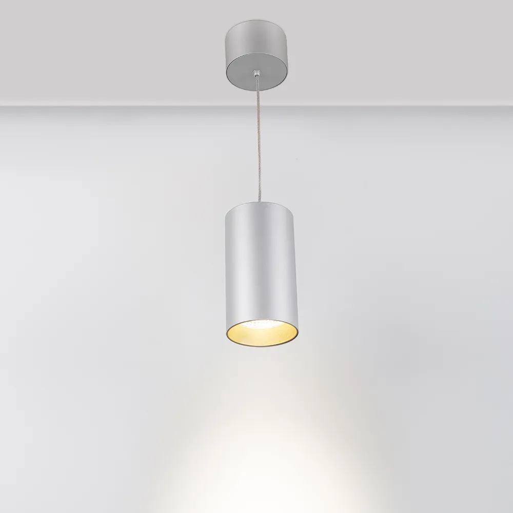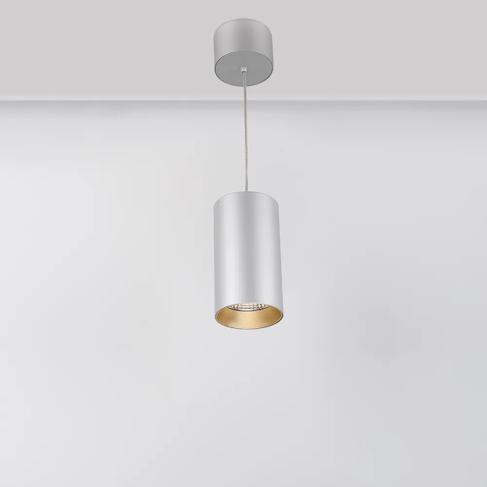 Подвесной светильник 15Вт, серебристый круглый корпус, золотистая вставка, металл. Цвет ДНЕВНОЙ БЕЛЫЙ 4000K, св.поток 1100лм, CRI(Ra)>80, угол 40°. Размер Ø85x155мм. Встроенный драйвер PRI:220-240VAC, SEC:DC 500mA 23-36V 15Вт.