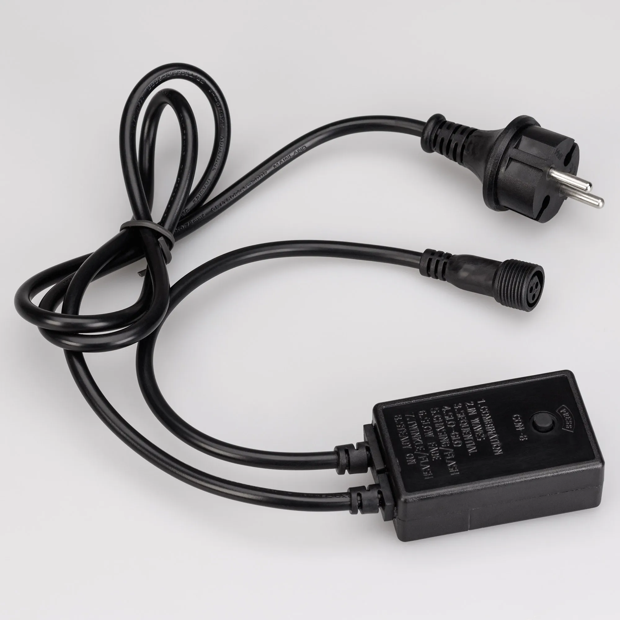 Контроллер для светодиодных гирлянд с эффектом динамики. Материал оболочки РЕЗИНА (каучук). Цвет провода чёрный. В комплект входит: провод питания с вилкой европейского стандарта (IP44), 3pin разъём подключения к гирлянде, выпрямитель AC/DC (1.6A), контроллер для смены режимов динамического свечения (8 режимов). Длина провода 1.5 метра.