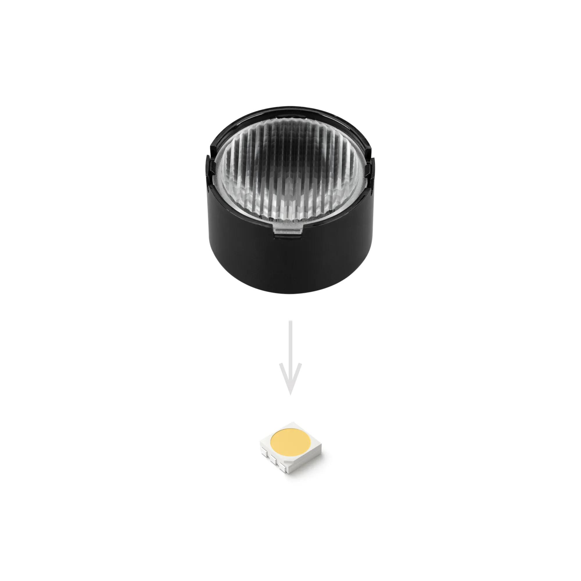Поставка под заказ от 1800 шт. Одиночная линза со съемным холдером черного цвета для светодиодов SMD: 2525, 2835, 3030, 3535, 5050. Угол обзора: вертикальный 15°, горизонтальный 55°, прозрачная микропризма. Материал PMMA. Диаметр 19.5 мм, высота 11.76 мм.