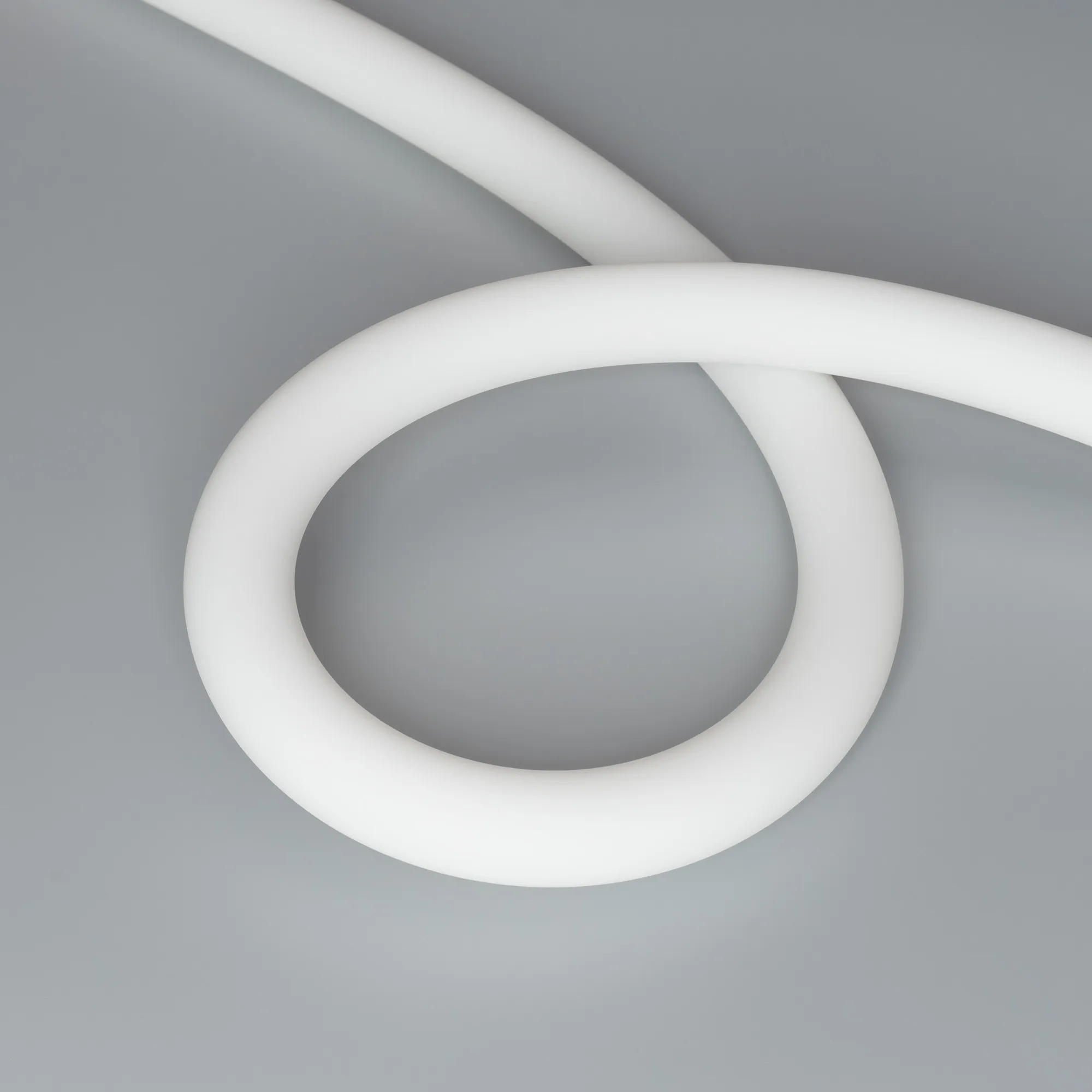 Гибкая герметичная лента (неон серии MOONLIGHT), сечение 25×25 мм. Светодиоды SMD 2835 336 шт/м. Цвет свечения ТЕПЛЫЙ БЕЛЫЙ (2700 К), индекс цветопередачи CRI>90, световой поток 950 лм/м, угол излучения 360°. Мощность 14.4 Вт/м, питание 24 В. Класс пылевлагозащиты IP65. Размеры 5000×25×25 мм. Произвольная резка. Изгиб согласно метки на корпусе, минимальный радиус изгиба 150 мм. Кабель питания длиной 500 мм, вывод с двух сторон вдоль линии сечения неона. Катушка 5 м. Цена за 1 м. Гарантия 3 года.