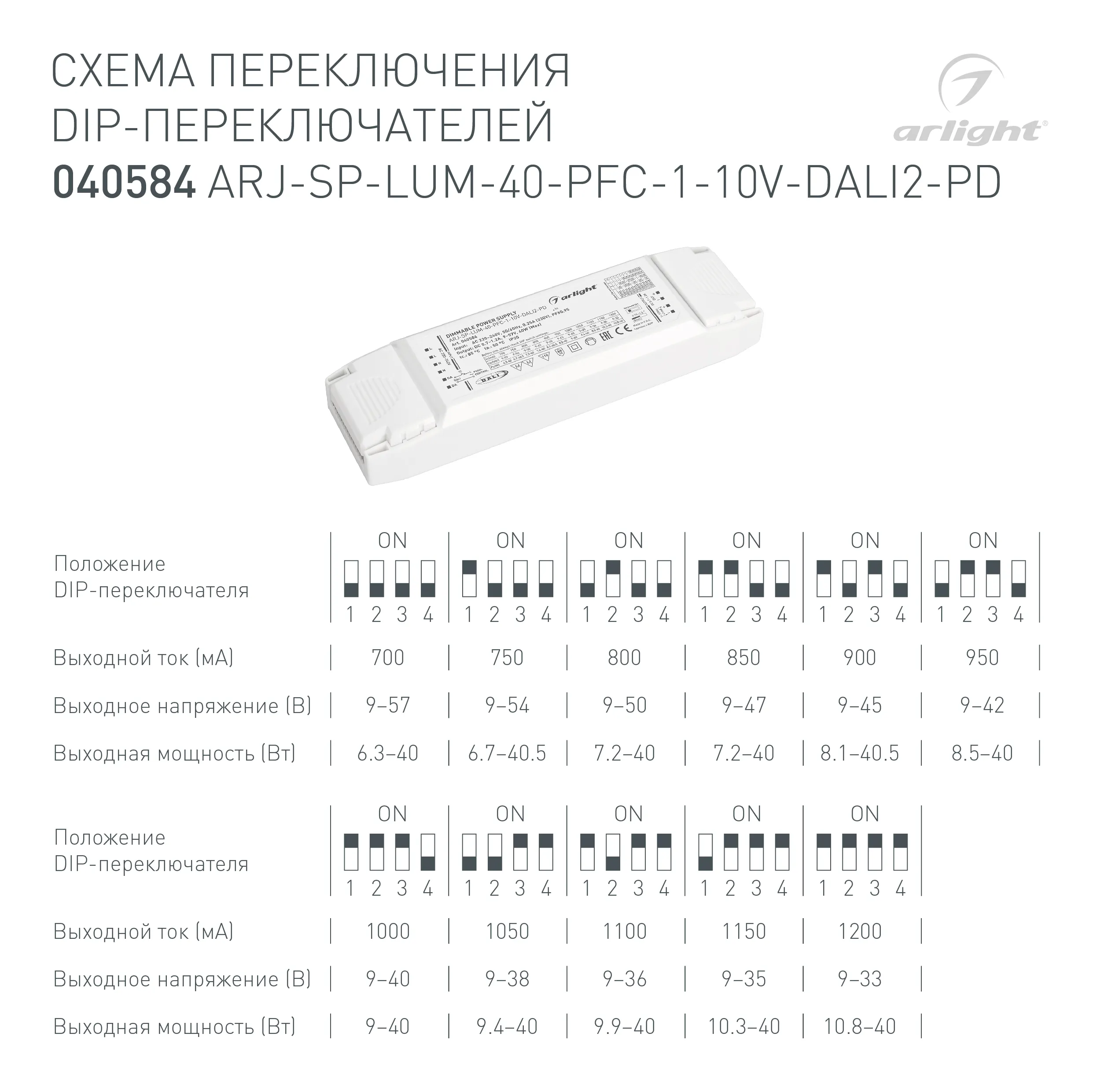Блок питания ARJ-SP-LUM-40-PFC-1-10V-DALI2-PD (40W, 700-1200mA) (Arlight, IP20 Пластик, 5 лет)