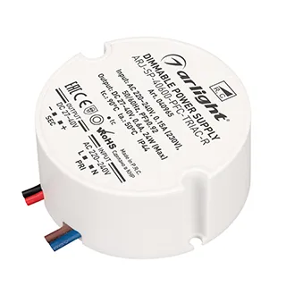 Диммируемый источник тока по стандарту TRIAC с гальванической развязкой для светильников и мощных светодиодов. Входное напряжение 220-240 VAC. Выходные параметры: 27-40 В, 600 mА, 24 Вт. Встроенный PFC >0,92. Негерметичный пластиковый корпус IP 44. Габаритные размеры диаметр в окружности Ø57 мм, высота 26 мм. Гарантийный срок 5 лет.