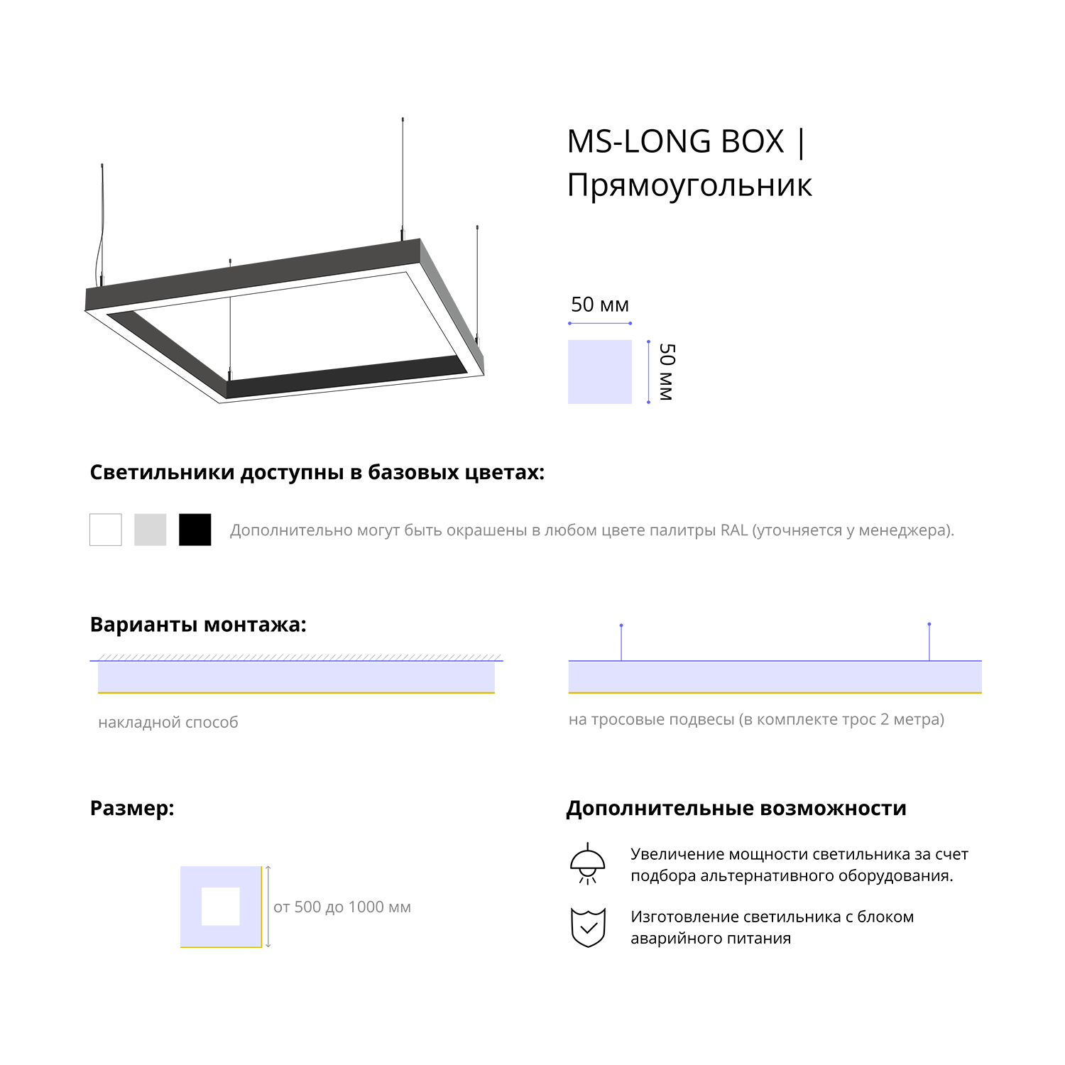 Cветодиодный фигурный светильник MS-LONG BOX Квадрат размер профиля 50x50мм длиной 1000х1000мм мощностью 150W. Светильник собирается из алюминиевого основния с матовым рассеивателем, который дает равномерную засветку по всей площади.
