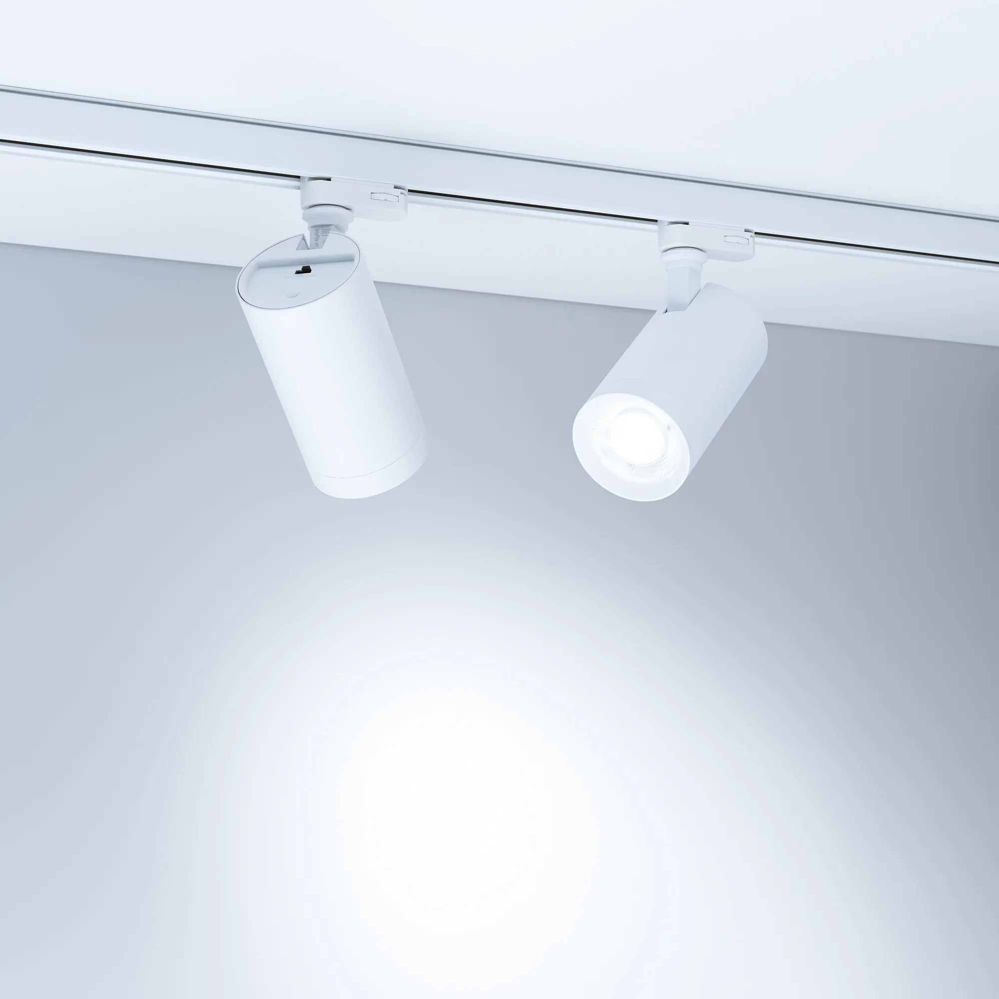 Светильник для треков/шин 4 провода, 30Вт. Цвет свечения меняется в диапазоне 2700К-4000К-6000К (при помощи переключателя на корпусе), световой поток 2150-2830 лм, 71-94 лм/Вт, угол 38°, CRI>95. Корпус круглый, алюминий, цвет белый, IP20. Размеры DxL Ø85x160 мм. Входное напряжение AC220-240V, мощность 30Вт. Драйвер встроенный 26-42 В, 700 мА. Диммирование по TRIAC.