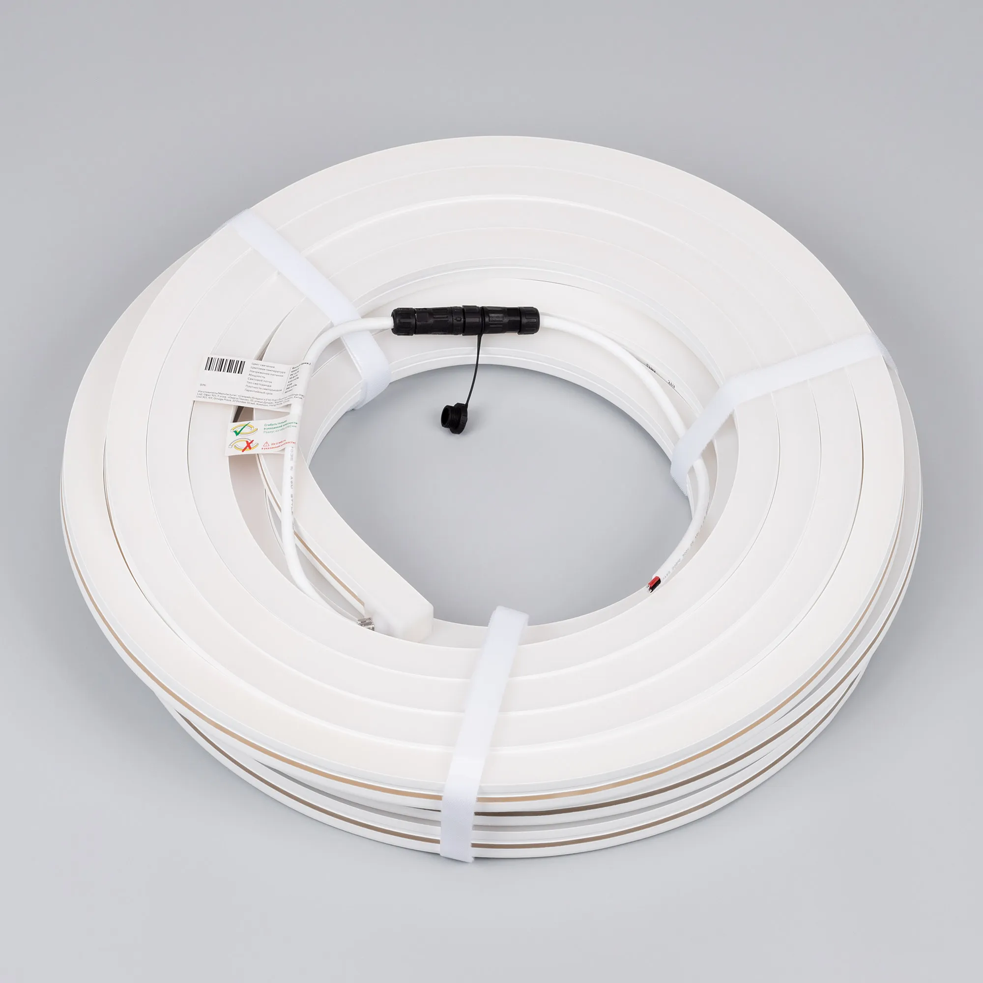 Гибкая герметичная лента (неон серии MOONLIGHT), сечение 20×20 мм. Светодиоды CSP 280 шт/м. Цвет свечения ТЕПЛЫЙ (2700К), индекс цветопередачи CRI>90, световой поток 460 лм/м, угол излучения 114°. Мощность 10 Вт/м, питание 24 В. Класс пылевлагозащиты IP67. Размеры 15000×20×20 мм. Мин. отрезок 50 мм. Горизонтальный изгиб SIDE, минимальный радиус изгиба 180 мм. Катушка 15 м. Цена за 1 м. Гарантия 5 лет.