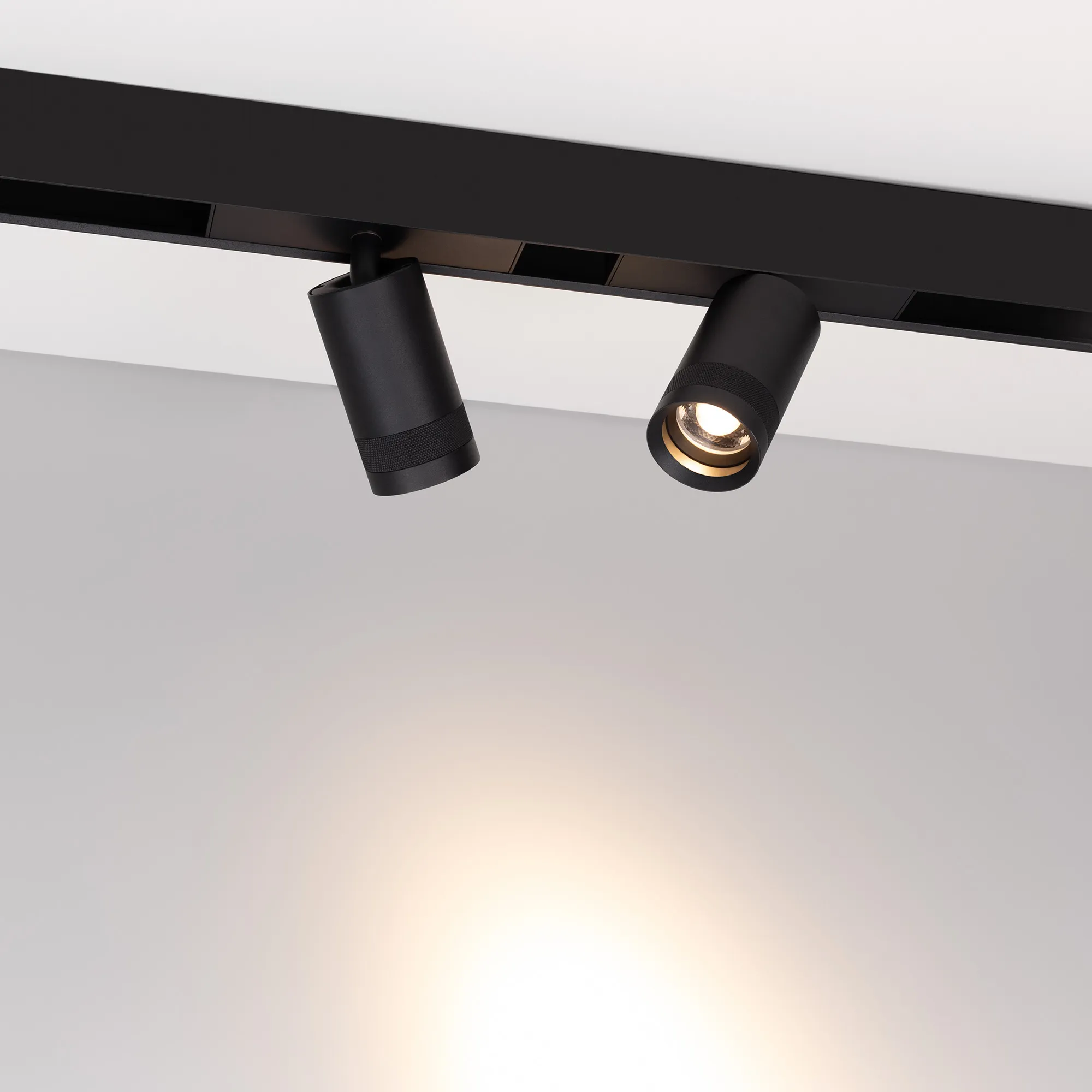 Светильник поворотный для магнитных треков шириной 45мм, 15Вт. Цвет свечения ТЕПЛЫЙ 3000K, световой поток 1080-1170 лм, угол 15-50°, CRI>90. Корпус цилиндрический, металл, цвет черный, IP20. Размеры LxWxH 163×60×161мм. Входное напряжение DC24V, мощность 15Вт. Драйвер DС24V/AC230V поставляется отдельно.