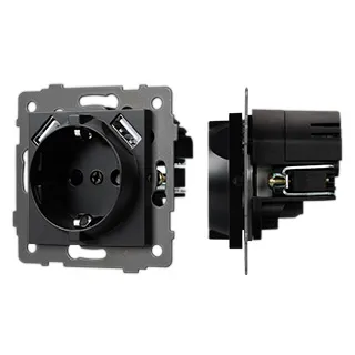 Механизм розетки с заземлением на 1 пост и 2USB Type A порта. Цвет - черный. Без фронтальной рамки. Уровень пылевлагозащиты IP20. Устанавливается в стандартный подрозетник.