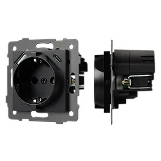 Механизм розетки с заземлением 1 пост 2 USB Type A+C порта. Цвет - черный. Без фронтальной рамки. Уровень пылевлагозащиты IP20. Устанавливается в стандартный подрозетник.