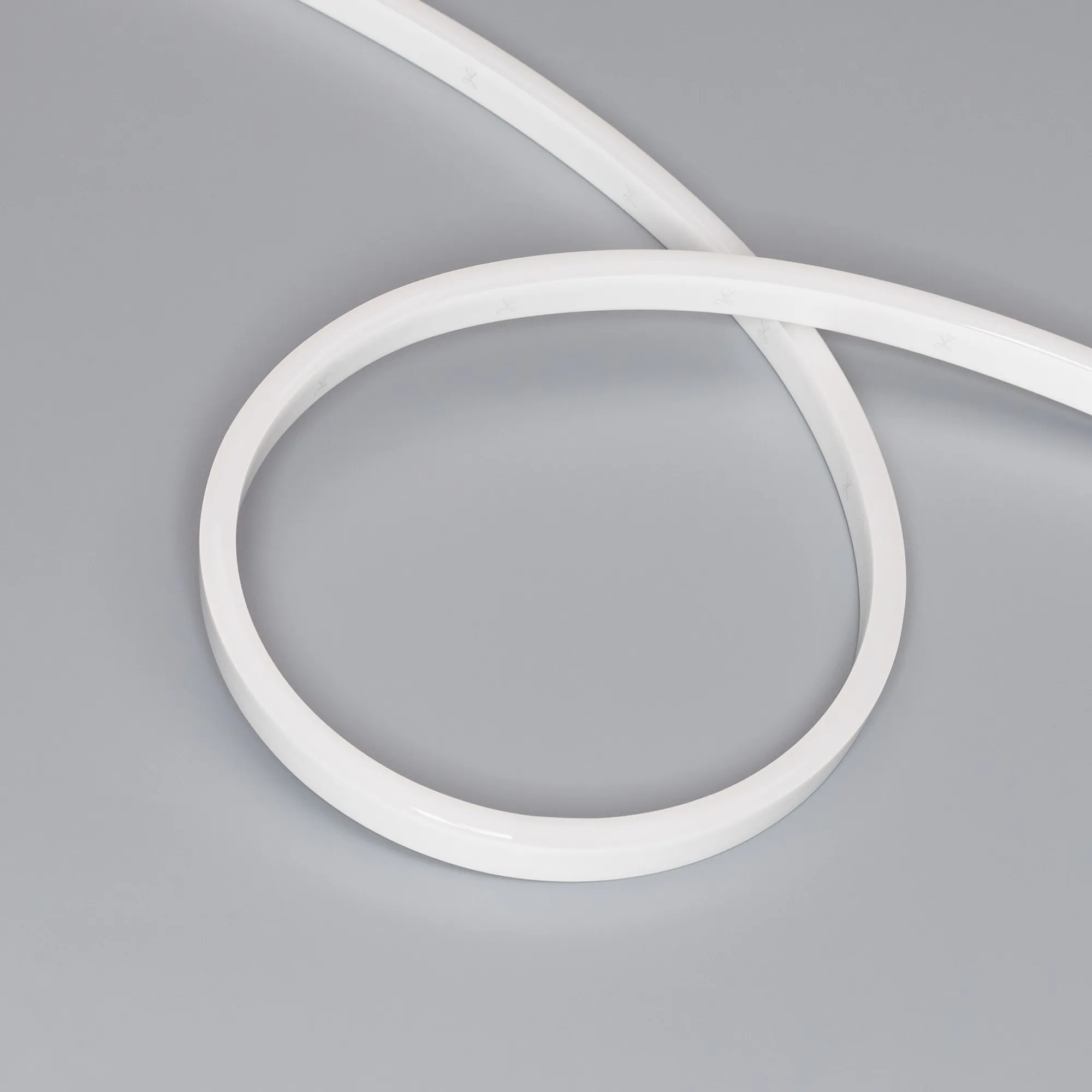 Гибкая герметичная лента (неон серии WAVE), сечение 06×12 мм. Светодиоды SMD2835 120 шт/м. Цвет свечения ТЕПЛЫЙ БЕЛЫЙ (3000 K), индекс цветопередачи CRI>90, световой поток 398 лм/м, угол излучения 125°. Мощность 8 Вт/м, питание 24 В. Оболочка из Полиуретана (PU). Класс пылевлагозащиты IP68. Размеры 1000×06×12 мм. Не подлежит резке. Горизонтальный изгиб SIDE, минимальный радиус изгиба 30 мм. Катушка 1 м. Цена за 1 м. Гарантия 3 года.