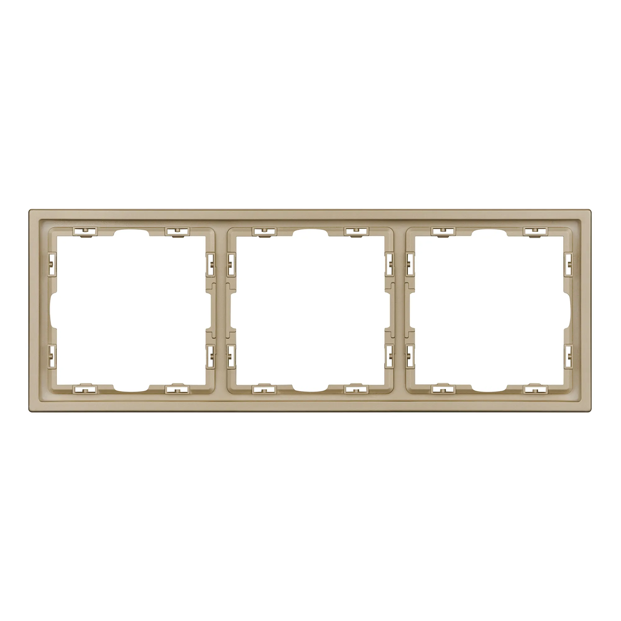 Рамка пластиковая на 3 поста, под встраиваемый механизм. Цвет - золотой, с Soft-Touch покрытием. Среднего уровня герметичности IP20. Ориентация монтажа горизонтальная.