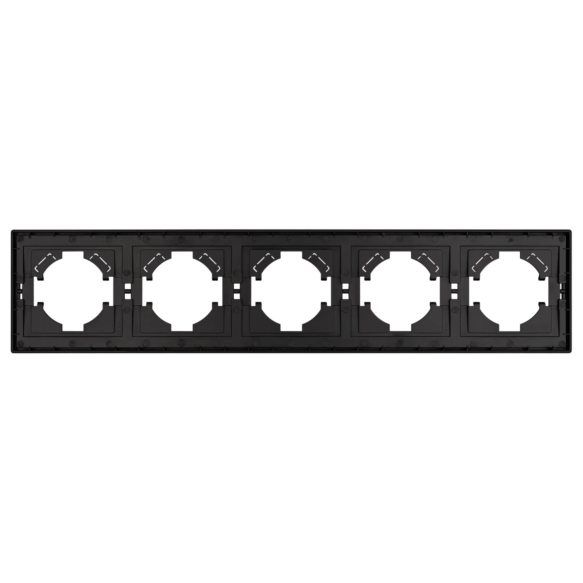 Рамка пластиковая на 5 постов, под встраиваемый механизм. Цвет - черный. Среднего уровня герметичности IP20. Ориентация монтажа горизонтальная.