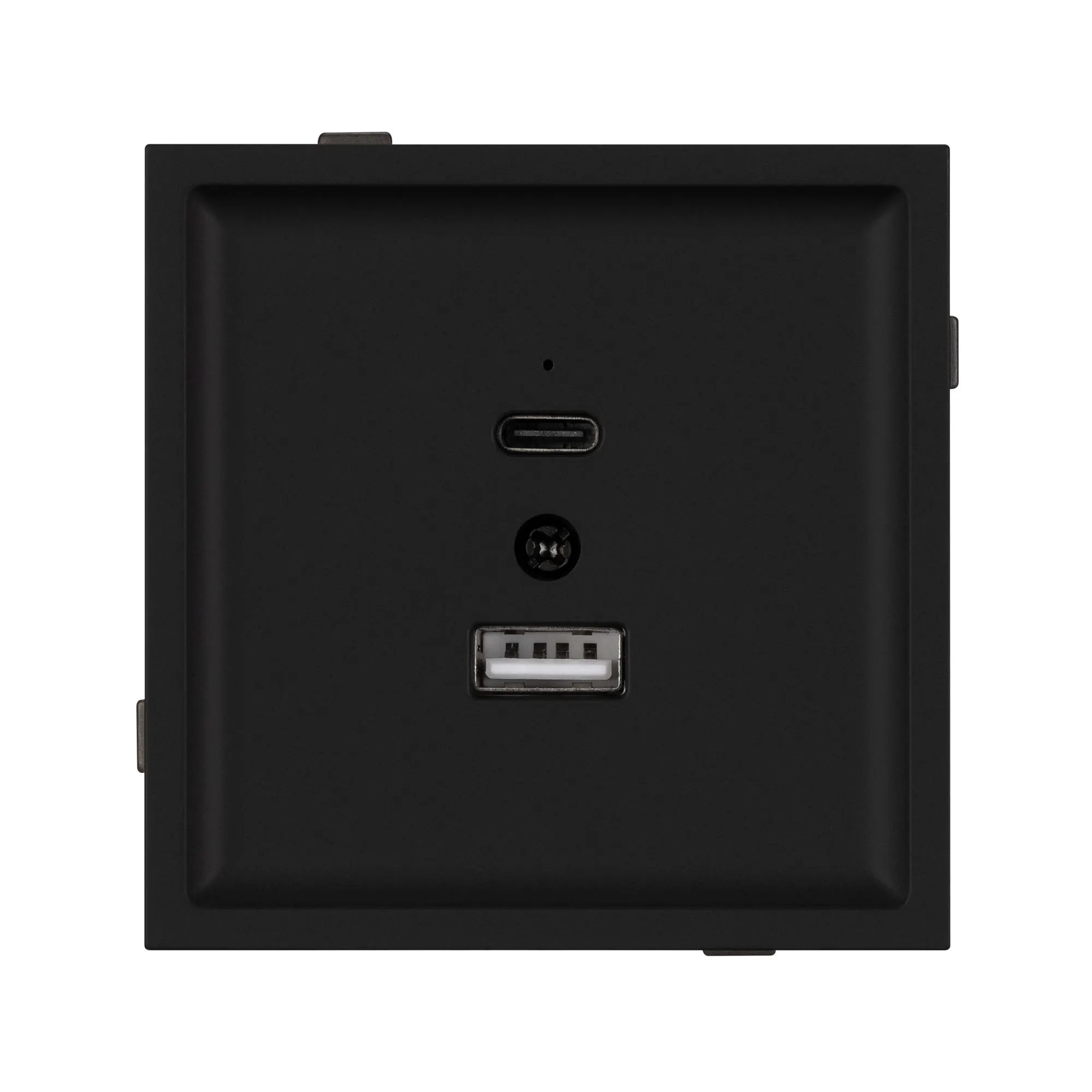 Механизм USB розетки на 2 порта Type A + Type C . Цвет - черный, с Soft-Touch покрытием. Без фронтальной рамки. Выходная мощность для USB Type C порта не превышает 20W. Уровень пылевлагозащиты IP20. Устанавливается в стандартный подрозетник круглого сечения диаметром 60мм.
